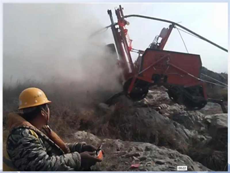 恒睿遙控爬坡鉆機采用四輪驅動牽引設計,爬坡能力和越障能力尤為突出,坡面移動速度可達 15 米 / 分鐘,在凹凸不平的山坡上也能靈活穿梭,無需起吊設備輔助移動,大大減少了設備調度時間。其鑿巖鉆孔速度達 1 米 / 分鐘,搭配高效動力系統,顯著提升了施工進度。更重要的是,整機支持全遙控操作,從爬坡、俯仰到打鉆,單人即可完成全部流程,無需搭設腳手架,既降低了人工成本,又避免了施工人員在陡坡作業的安全風險。