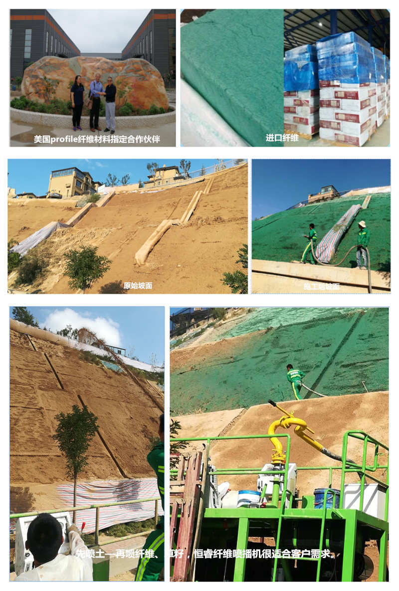 今年8甘肅省蘭州市城關區碧桂園小區噴播綠化使用了我公司比較有代表性的纖維噴播機,纖維噴播機是在設備中加入各種基材和草纖維,一次成型5公分厚,種子被纖維覆蓋,然后發芽,而之后的纖維腐化也成為了肥料。要達到很好的噴播效果就要對設備、材料、種草工藝都有很高的要求,我公司選用的是美國profile纖維材料,它的優點直接與土壤粘合即時效率高、防雨水沖刷性強、防侵蝕性強、保水性強、肥效強等作用,我公司是該材料的指定合作伙伴。此次在我們技術人員用心指導下恒睿的噴播工藝、噴播綠化效果、良好的售后服務被蘭州客戶地認同。